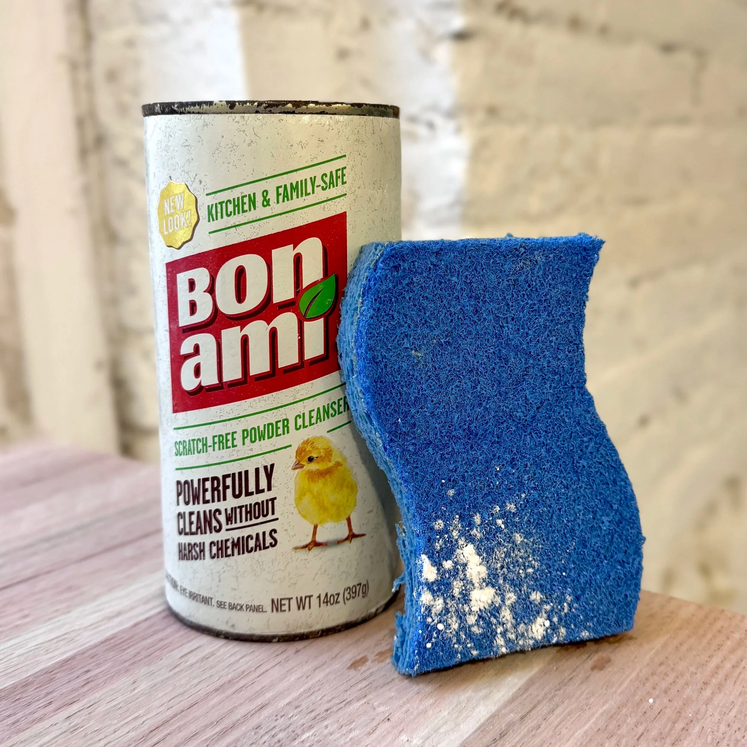 Also effective but not our go-to because you’ll need to use gloves to use this product safely. Similar approach—using gloves, apply to a damp surface, gentle scrub, rinse.